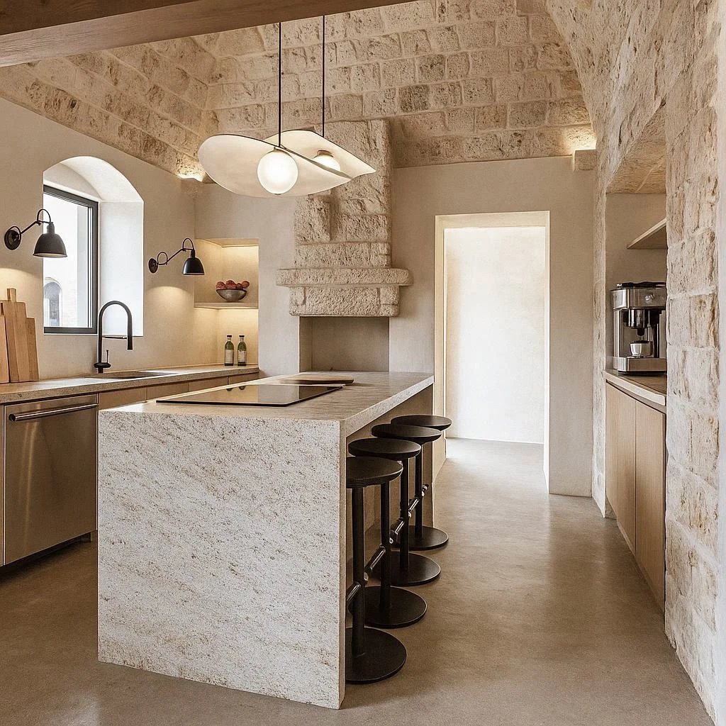 In the countryside of Ostuni, A cluster of trulli and a lamia are being restored with a contemporary sensibility. While preserving the original fabric, the spaces are finished with polished concrete floors, modern furnishings, and curated lighting. The result is a fluid, apartment-like layout in the heart of Puglia.